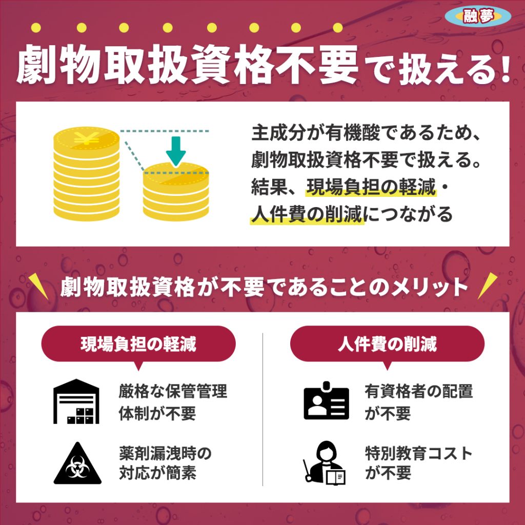 - 安全・容易な運用:劇物を避けて誰でも扱える仕組みにすることで、労働安全と作業効率を両立。