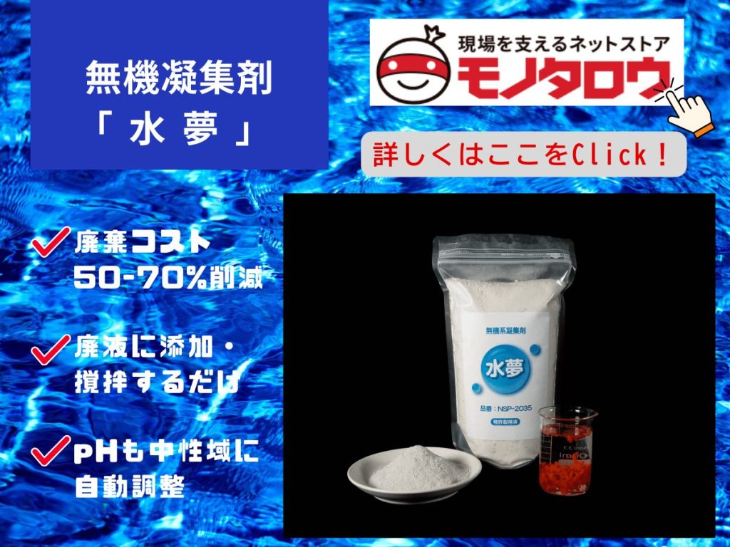 ● 代替中和法の活用: 従来型の酸・アルカリ投入以外に、コストメリットのある中和技術を検討することも重要です。例えば前述した炭酸ガス中和は薬品費用がほとんどCO₂ボンベ代だけで済み、しかも過剰注入してもpHがそれ以上下がらない性質から薬剤ロスが極めて少ない手法です。初期設備こそ必要ですが、長期的にはランニングコスト優位になる場合があります。特にボイラー排水などアルカリ度が高いが量は限られるケースでは、排ガスのCO₂を利用する中和システム導入で薬品を一切使わず処理し、年間数百万円の薬剤費を削減した事例も報告されています。また、アクト社の無機凝集剤「水夢」のようにpH調整不要で排水処理できる薬剤を使うのも画期的な方法です。水夢は特殊な無機高分子薬剤で、適用できる排水では中和操作そのものを省略できるため、pH調整剤の費用がゼロになり、トータル処理コストを大幅に低減できます(同時に汚泥発生量も少なくなるメリットがあります)。このように、最新の薬剤やプロセスを取り入れることで従来比○%のコスト削減が可能になるケースもあるため、定期的に業界情報を収集し自社プロセスに適用できないか検討することが大切です。