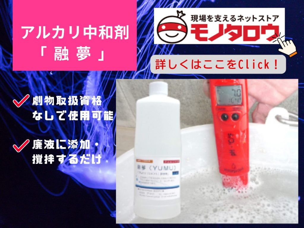 - 建設業(セメント系排水): 建築現場やコンクリート製品工場から出る排水は、pH11~12以上の強アルカリ性になることが知られています。セメントやコンクリートから水酸化カルシウム等が溶出するためで、放流するには確実な酸による中和が必要です。従来、このようなアルカリ排水には希塩酸や硫酸を用いて中和する方法が一般的でした。しかし建設現場では危険物の取り扱い資格を持った作業員がいない場合も多く、劇物に該当する強酸を現場で使うことが難しい課題がありました。そこで近年注目されているのが、有機酸ベースの中和剤や炭酸ガス中和装置です。たとえばアクト社が開発した融夢(YUMU)は主成分が有機酸で劇物に当たらない中和剤であり、セメント洗浄水などの中和に最適です。劇物ではないため誰でも扱え、専用設備も不要で既存の撹拌槽さえあれば短時間で効率的にpHを下げられます。実際にコンクリート工事現場で、硫酸の代替として融夢を投入したところ、わずかな量で大量の高pH排水を中和でき、作業時間の短縮と薬品コスト削減に大きく貢献した例があります。一方、土木工事では炭酸ガスを用いたCO₂中和装置をレンタル設置し、ポンプと拡散管でCO₂を溶解させてpH調整する手法も普及しています。こちらは高価な強酸を使用せずに済むこと、及びpH値を過剰に酸性側へ振りにくい安全性から、トンネル工事などで採用例があります。建設業の排水は一時的・局所的な発生が多いため、扱いやすさと即効性、コストのバランスで薬剤や装置を選定することになります。
