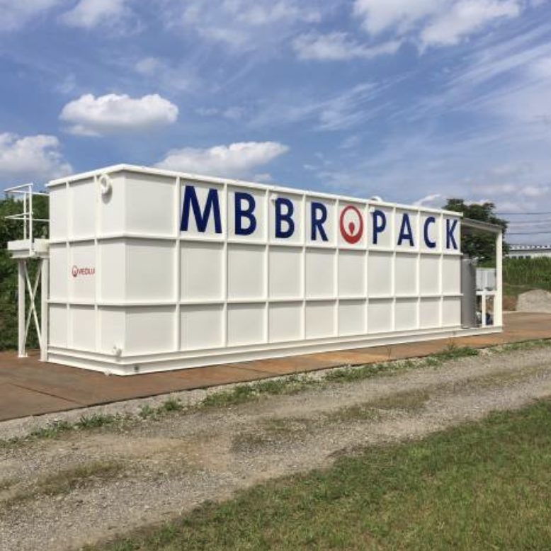 大規模仮設汚水処理ユニットの例(輸送コンテナ型):1基で1,000㎥/日の処理能力を持ち、工場の大規模更新工事や災害時の仮設処理施設として活用できる。一体型ユニットにブロワや制御盤まで搭載され、現地で配管するだけで稼働可能な移動式装置である。