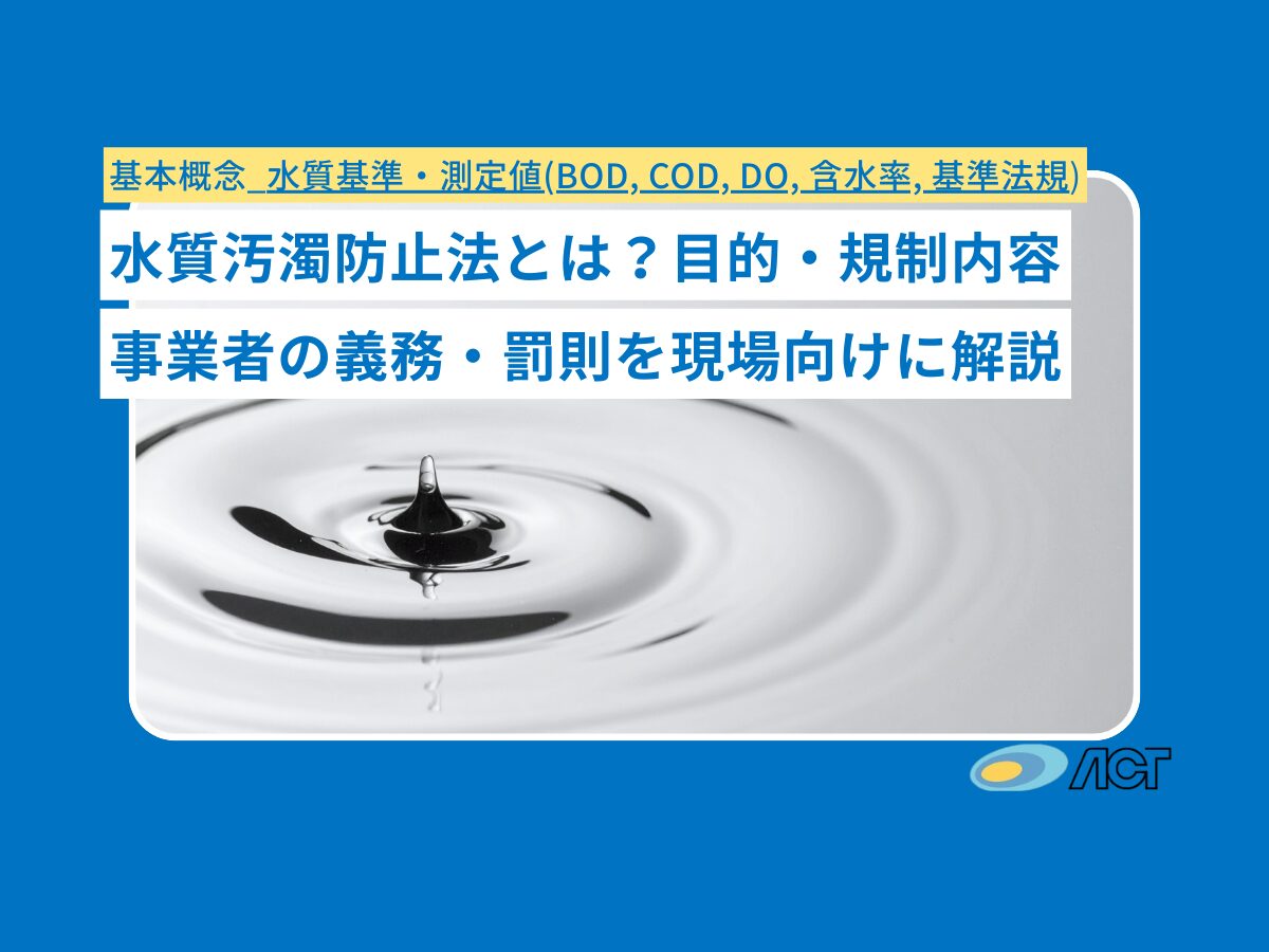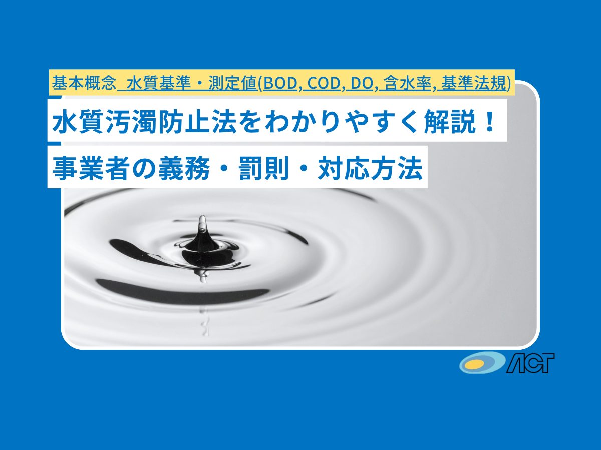 工場や事業場から出る排水による水質汚染を防ぐために制定された水質汚濁防止法。企業の排水管理担当者にとって、コンプライアンス上欠かせない重要な法律ですが、専門用語も多く内容が複雑で「自社はちゃんと法令遵守できているのか?」と不安になる方も多いのではないでしょうか。ここでは水質汚濁防止法の目的や基本概念から事業者の義務、排水基準や総量規制の仕組み、違反時の罰則まで、ポイントをかみ砕いて解説します。また、業種ごとに求められるコンプライアンス体制の構築方法や、近年の法改正動向への対応策についても紹介します。最後に、株式会社アクトのソリューションによる法令対応支援実績と効果もご紹介します。適切な対応でコンプライアンスを確保し、リスク回避と環境保全を実現していきましょう。