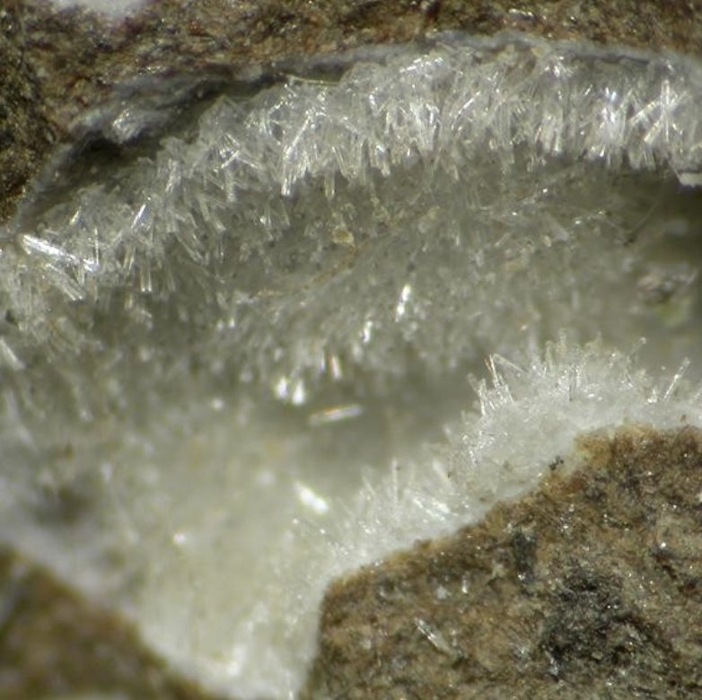 エリオン沸石(Erionite)は繊維状のゼオライト鉱物で、結晶が針のように細長いため粉塵が肺に入り込みやすく、長期間吸入すると中皮腫などのリスクを高めます。またIARC(国際がん研究機関)ではエリオン沸石をグループ1(ヒトに対し発がん性あり)に分類しています 。写真は岩石中のエリオン沸石結晶(白い繊維状部分)。